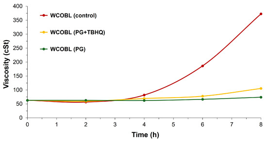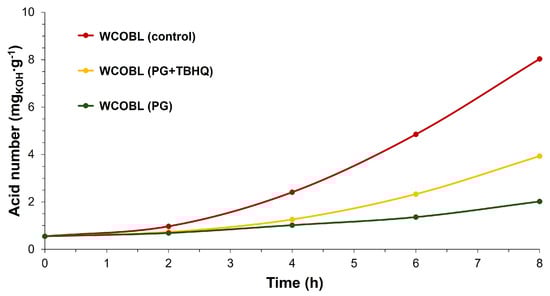 Finally, WCOBL (both control samples and samples with TBHQ and/or PG optimum addition) underwent extreme oxidation conditions to assess its quality loss during oxidation or storage, according to previous studies where the same methodology was used in biodiesel []. In this sense, the experiment was similar to the Rancimat method, with slight modifications. Thus, air (500 mL∙min−1) was bubbled into a certain amount of sample (9 g in this case) at 110 °C, with different parameters such as viscosity and acidity measured at different oxidation times (2, 4, 6, and 8 h). When the sample had antioxidants, the corresponding voltammetric analysis was carried out to quantify the quantity of antioxidants remaining in the sample. A comparison between control samples and those with antioxidant addition was carried out to evaluate the effectiveness of PG and TBHQ on WCOBL.
