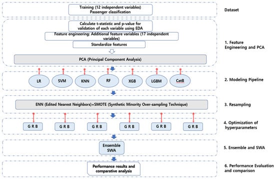 The proposed ‘Structure of Survival Prediction Research System’ study consists of six major steps: (1) Feature Engineering and PCA, (2) Modeling Pipeline, (3) Resampling, (4) Optimization of hyperparameters, (5) Ensemble and SWA, and (6) Performance Evaluation and Comparison. These steps are summarized in Figure 1.