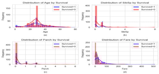 The four plots illustrate how key characteristics—Age, SibSp (siblings/spouse aboard), Parch (parents/children aboard), and Fare—are distributed based on Titanic passengers’ survival status (Figure 2): (a) survivors tend to be slightly younger than non-survivors, but the difference is not statistically significant (p~0.053), and both groups show a non-normal distribution; (b) while survivors generally have fewer siblings or spouses on board, the difference between survivors and non-survivors is not significant (p~0.292), with both distributions being non-normal; (c) survivors tend to have higher Parch values, indicating they traveled with more family members, and this difference is statistically significant (p~0.015), though both groups are non-normally distributed; and (d) survivors paid significantly higher fares, indicating that passengers in higher classes had better chances of survival, with the difference being highly significant (p = 0.000) and both groups showing non-normal distributions.