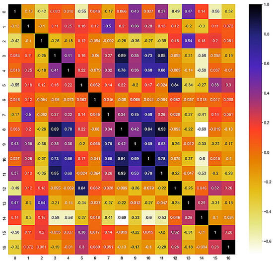 Figure 3 generates a correlation heatmap to evaluate and compare feature correlations across multiple steps of data processing to ensure consistency across the dataset. This heatmap shows the normalized and processed correlation matrix of the dataset, excluding the target variable (Survived). The 17 features displayed in the heatmap represent the processed and engineered variables utilized for model training after the completion of all preprocessing steps. These features are the result of various preprocessing steps, such as categorical variable encoding, feature interactions, and missing value imputation. The features included in this heatmap are the features selected to train the model after applying the necessary transformations. The 17 variables used are defined in Table 1, which details the rationale for including each feature and its expected influence on the survival prediction.