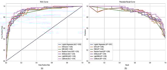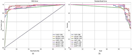 Figure 12 evaluates the performance of seven machine learning models using the ensemble voting classifier. The performance of the models is measured using two main metrics: Area Under the Receiver Operating Characteristic curve (AUC) and Average Precision (AP).