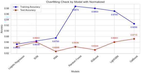 The overfitting assessment, visualized in Figure 5, highlights significant overfitting in models such as Random Forest and XGBoost, where training accuracies (98.74% and 98.03%) were much higher than test accuracies (84.36% and 83.24%, respectively). This indicates that these models tend to memorize the training data and struggle to generalize to new data. Logistic Regression and SVM, with closely aligned training and test accuracies (Logistic: 85.25% training, 84.36% test; SVM: 86.38% training, 86.03% test), exhibited minimal overfitting. CatBoost also showed a relatively small gap between training (92.56%) and test accuracy (87.15%), although there was still a slight tendency to overfit. LightGBM demonstrated a larger gap (97.05% training, 86.03% test), but it remained within a reasonable range.