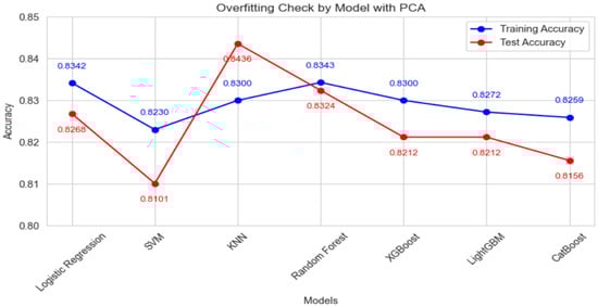 Figure 6 demonstrates that applying Principal Component Analysis (PCA) significantly reduces overfitting in all models compared with their performance without PCA. Previously, models such as Random Forest exhibited substantial overfitting, with a large discrepancy between training and test accuracies. After applying PCA, overfitting was mitigated, resulting in more balanced performance across training and test datasets. For example, Random Forest, which previously had a training accuracy of 98.74% and a test accuracy of 84.36%, now shows more balanced results with a training accuracy of 83.43% and a test accuracy of 83.24%. This indicates that PCA effectively reduces model complexity, helping to prevent overfitting by removing noise from the training data, resulting in improved generalization to unseen data.