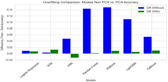 Figure 7 compares the models with and without PCA, focusing on the difference between training and test accuracies, a direct indicator of overfitting. A large difference suggests that the model is overfitting, as it performs well on the training data but poorly on the test data.