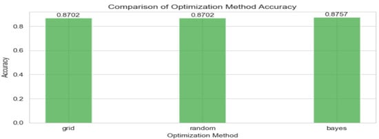 Figure 9 presents a comparison of the accuracy achieved by each optimization method. First, grid search exhaustively explored all possible combinations of predefined hyperparameters, yielding an accuracy of 0.8702 and a mean absolute error (MAE) of 0.0803, albeit at a significant computational cost. Second, random search efficiently sampled random combinations, resulting in the same accuracy and MAE as grid search while requiring fewer computational resources. Finally, Bayesian optimization employed a probabilistic model to focus on the most promising regions of the hyperparameter space, achieving the highest accuracy of 0.8757 and a lower MAE of 0.0730, thus proving to be the most effective method in terms of both performance and computational efficiency. The best hyperparameters identified by Bayesian optimization included a moderate regularization strength (C = 0.0101) and a maximum iteration count of 121. Therefore, Bayesian optimization was determined to be the most effective approach for optimizing model performance while balancing computational cost.