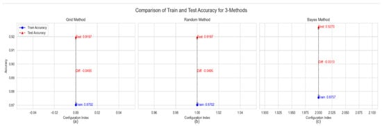 Figure 10 further illustrates the differences between training and test accuracy for each method, with arrows highlighting potential overfitting. Grid search and random search both showed a difference of −0.0495 between training and test accuracy, while Bayesian optimization exhibited a slightly larger gap of −0.0513. Despite this small difference, Bayesian optimization still demonstrated the lowest overall risk of overfitting, indicating better generalization to unseen data compared with the other methods. Therefore, Bayesian optimization was identified as the most effective method, balancing model complexity, generalization, and computational efficiency. Based on one’s code and output, the result from Bayesian optimization will be returned as the best estimator.
