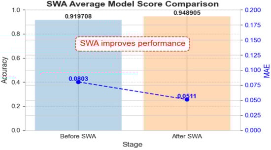 The ensemble model was initially evaluated without SWA. The Stacking classifier, using XGBoost as the meta-model, and the Voting classifier, which employed a soft voting mechanism, were applied to the test data. The accuracy and mean absolute error (MAE) were calculated to assess the model’s performance. The model achieved an accuracy of 0.9197 and an MAE of 0.0803, indicating strong baseline performance with reasonable accuracy and minimal error.