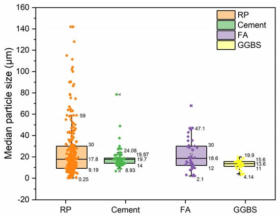 Median particle size (D50, μm) for RP, cement, FA, and GGBS.