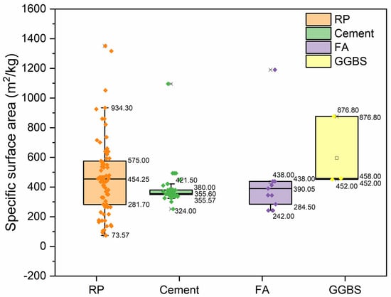 Figure 2 presents the SSA of RP reported in literature compared to PC, FA, and GGBS. There is a substantial variation in SSA values for RP, with an average of 454.25 m2/kg and atypical points from 281.7 m2/kg to 575 m2/kg. The maximum value is 1351 m2/kg [] and the minimum value is 73.57 m2/kg []. In the case of cement, FA, and GGBS, SSA data have averages of 355.6 m2/kg, 390.05 m2/kg, and 458 m2/kg, respectively.