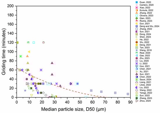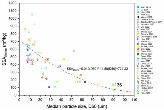 Specific surface area (m2/kg) versus median particle size (D50, μm) [,,,,,,,,,,,,,,,,,,,,,,,,,,,,,,,,,,,].