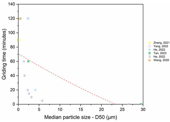 Median particle size (D50, μm) versus wet grinding time (min) [,,,,,].