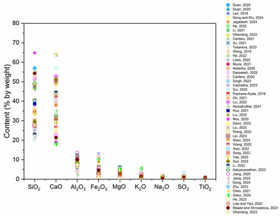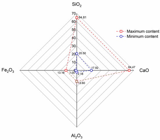 RP contains quartz (SiO2) from sand and residues of coarse aggregate, as well as calcite (CaCO3). RP also consists of the hydration products portlandite (CH) and calcium silicate hydrate (C–S–H) gel, which are formed from the hardened cement paste, as well as belite (C2S) and alite (C3S), which primarily originate from the unhydrated cement particles in the hardened cement [,,,,,,,,,,,,,,,,,,,,,,,]. The maximum and the minimum values of major components (SiO2, CaO, Al2O3, and Fe2O3) of RP are presented in Figure 7.