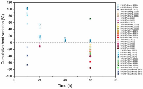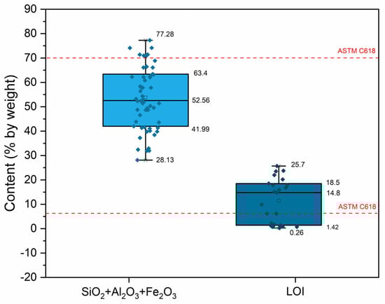 On the other hand, the maximum loss on ignition (LOI) requirement, 6% [], is not met for most of the cases as presented in Figure 9. It is important to mention that not all studies provide complete data, especially on LOI, which is essential for categorizing the substance as pozzolanic. Increased LOI in RP compared to cement is due to the breakdown of hydration products and the high concentration of CaCO3 in RP [,]. With respect to LOI, RP has a higher percentage of LOI than cement [,,,,]. The high LOI of RP should be attributed to the decomposition of hydration products and carbonation [,,,]. It should further be noted that the dry grinding and wet grinding process, grinding period, and finesse have a limited effect on the oxide content of RP [,,,,,,,,].