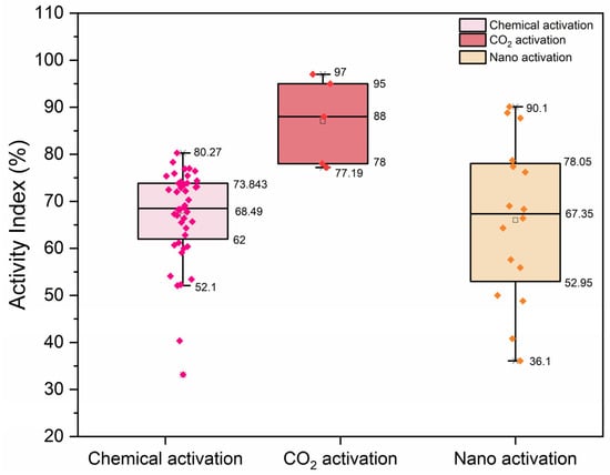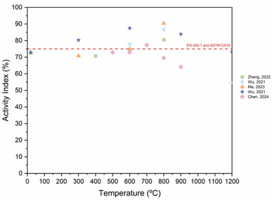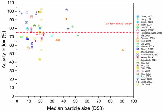 Regarding the standards, the majority of the studies measured the AI according to GB/T 1596 [,,,,,,,,,,,,,,], BS EN450–1 [,], or JG/T 573–2020 []. According to these standards, the AI is calculated by dividing the 28 d compressive strength of mortar with 30% SCM by the 28 d compressive strength of plain mix without SCM, and the AI of SCM should be above 70% [].