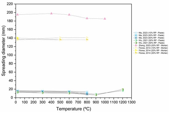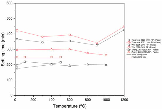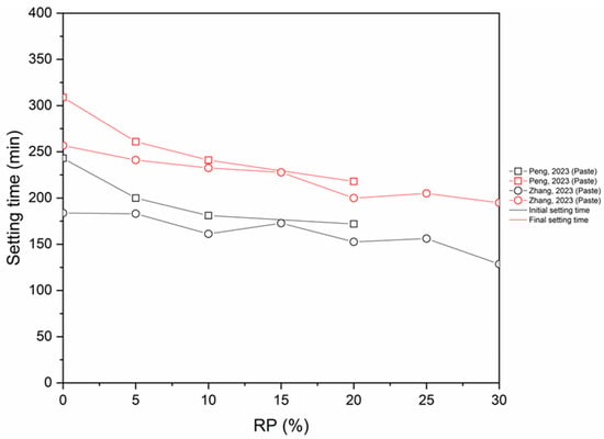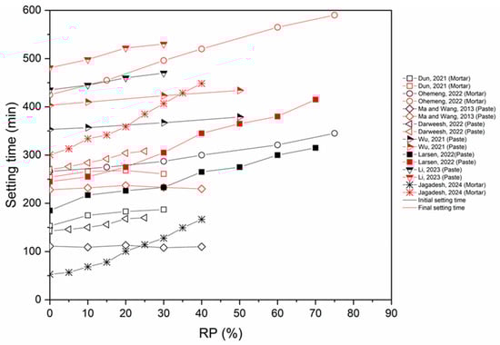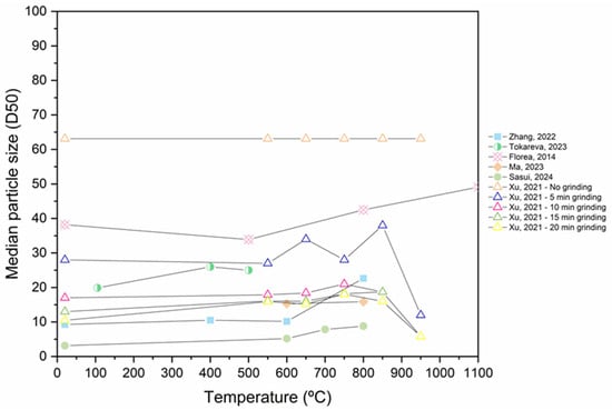 As stated in Section 3.2, for optimal reactivity and performance in cement-based materials, RP particles should be extremely fine. RP reactivity has been shown to increase with higher SSA and fineness, grinding time, and grinding type [,,,,,,]. High reactivity is due to the larger specific surface area, which leads to a greater reaction area and the availability of numerous active atoms that efficiently connect with other atoms [,,].