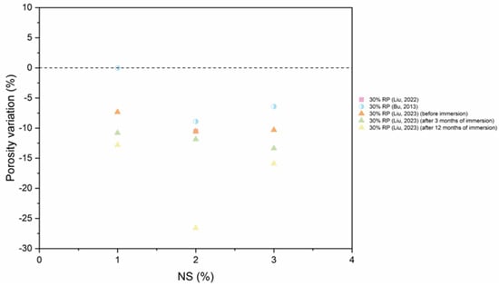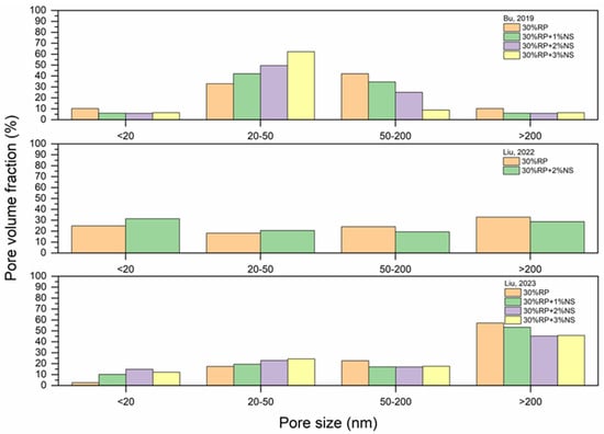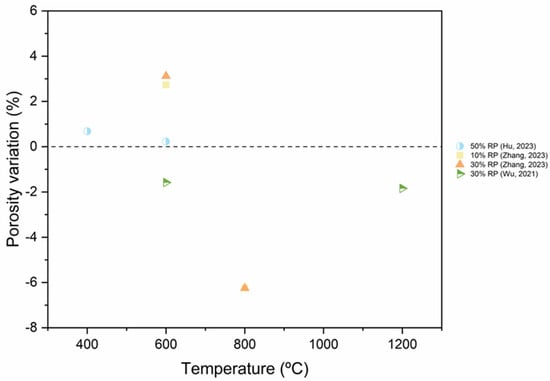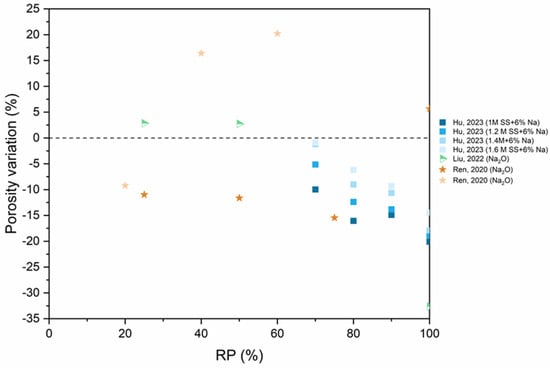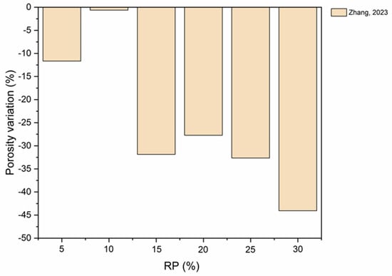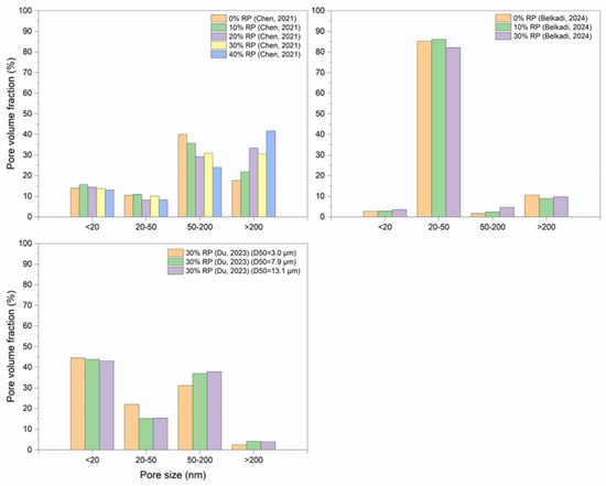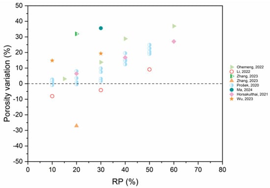 RP particles exhibit rough texture surfaces, a large number of pores, and microcracks [,,,,,,,,,,,,,,]. The surface of RP particles exhibits a higher degree of roughness compared to cement particles due to the presence of porous hydration products such as CH within the RP particles [,,,,,]. Therefore, RP is a material with higher permeability than cement [,,,,,,]. Furthermore, the presence of plate-like and needle-bar-like structures can be observed within the RP due to the inclusion of hydration products [,,,].