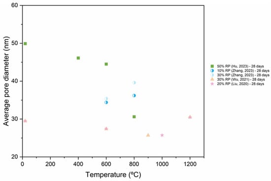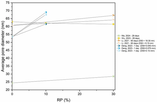 The particle size gradation was generally obtained using a particle size laser analyzer, image analyzer, and mercury intrusion porosimeter (MIP) in accordance with ASTM C204-11 [] and EN 196-6 []. Figure 1 summarizes the median particle size (D50) of RP reported in the literature compared to PC, FA, and GGBS. RP presents greater data dispersion, with maximum and minimum values of 142 μm [] and 0.25 μm [], respectively, and an average of 17.8 μm. Atypical points for RP are 9.19 μm and 30 μm. PC, FA, and GGBS present lower D50 value dispersion. The average D50s of cement and FA are 19.7 μm and 18.6 μm, respectively, which are similar to RP. Atypical points for cement are 14 μm and 19.97 μm and atypical points for FA are 12 μm and 30 μm. On the other hand, the D50 average of GGBS (13.6 μm) is smaller than RP. Atypical points for GGBS are 11 μm and 15.6 μm. When utilizing RP as an SCM, it is advisable to ensure it has a high reactivity and has a small particle size, comparable to or smaller than cement [,,,,]. These properties contribute to the hydration reaction by promoting nucleation, creating new hydrated products, and enhancing material compactness through a filling effect [,,].