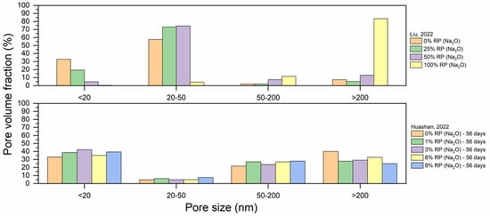 Song et al. [] and Li et al. [] argued that the reason for the relatively low CH content is the high alkalinity of RCP, which facilitates the carbonation of CH in RCP. Furthermore, they stated that the large surface area of RCP allows for greater contact between CH and air. Additionally, CH undergoes carbonization during the synthesis of RCP. The low content of ettringite can be attributed to its breakdown caused by the rise in temperature during RCP grinding [].
