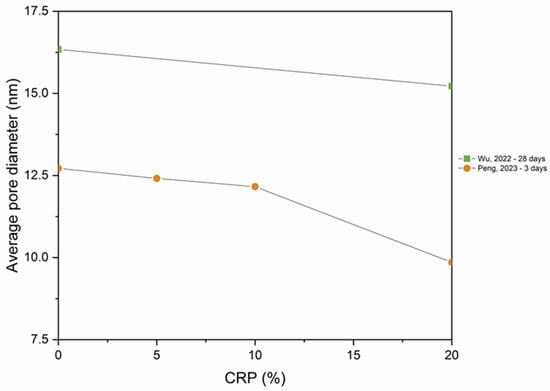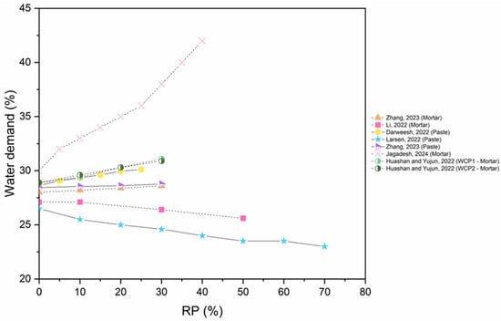 There is not an agreement in the literature on the specific ratio of chemical composition in relation to RP, as it varies based on its source and the type of aggregate used in the WC [,,,,,,]. Some research indicates that RP produced from demolition waste contains more SiO2 [,,,] and laboratory-produced RP contains more CaO [,,,].