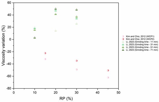 Based on the analysis of Figure 4 and Figure 5, 20 to 30 min is an appropriate duration for dry grinding, whereas 60 to 80 min is ideal for wet grinding [,,,,,,,,,,,], and the smallest RP particle sizes were produced by wet grinding [,,,].
