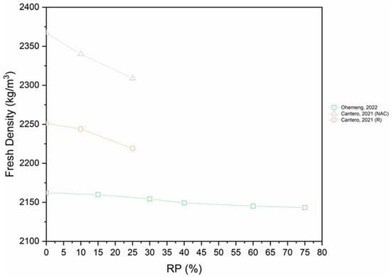 The densities of RP, cement, and FA that are presented in Figure 6 are a collection of data obtained from multiple investigations. As shown in Figure 6, the density of RP ranges from 2.025 g/cm3 [] to 2.9 g/cm3 [], with an average of 2.487 g/cm3. The density of RP is lower than the density of cement, which ranges from 3.03 g/cm3 [] to 3.190 g/cm3 [,] with an average of 3.125 g/cm3. Conversely, the density of RP is greater than that of FA, which is between the range of 1.861 g/cm3 [] to 2.99 g/cm3 [], with an average of 2.325 g/cm3.