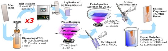 The prepared TiO2-coated mica substrates were used for Cu electroless deposition (Cu-ELD), as shown schematically in Figure 1.