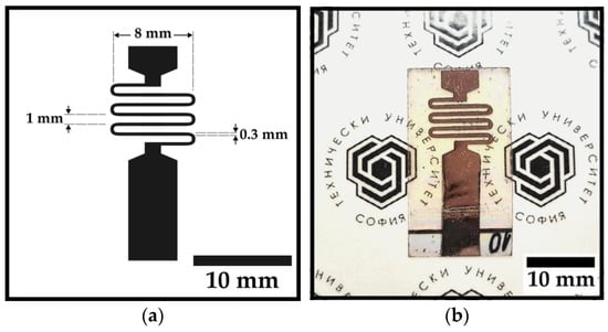 This method was further applied to study the feasibility of using the Cu-ELD layers in resistance temperature detectors (RTDs). RTD devices were fabricated using selective Ag activation to create a serpentine pattern on the TiO2/Mica surface. The serpentine design consisted of a 300 μm wide copper track with six loops, 1 mm pitch, 8 mm lateral width, and a total length of 55 mm, which is shown in Figure 2a. A 40 μm thick dry-film negative photoresist was laminated on the substrate and exposed through a photomask at a UV dose of 0.25 J cm−2. The photoresist was developed in 2 wt.% Na2CO2, followed by Ag activation and Cu-ELD, as described earlier. Prior to the Cu deposition, the photoresist was stripped using acetone. Figure 2b presents a photographic image of a finished Cu-ELD serpentine pattern, deposited on mica.