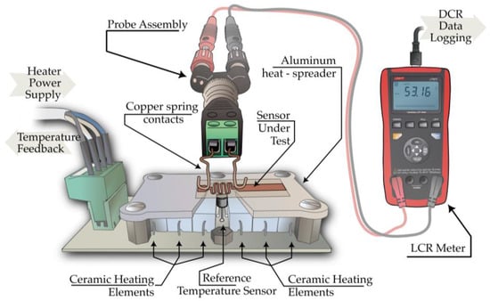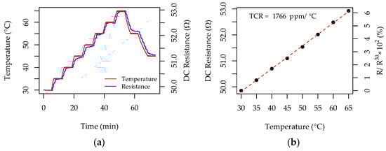 The sensor was placed on a temperature-controlled heating bed composed of six ceramic resistors (18 Ω, 5 W) arranged in parallel beneath an aluminum heat spreader (65 mm × 40 mm × 3 mm). A DS18B20 digital temperature sensor (Maxim Integrated, San Jose, CA, USA) embedded in the heat spreader provided feedback to an Arduino Nano microcontroller (Arduino SRL, Torino, Italy), programmed to maintain a temperature range of 30–65 °C. The temperature stability at each setpoint was ±0.14 °C, with heating ramp rates of 2.78 ± 0.34 °C min−1 across the range. Resistance measurements were taken in situ using a 2-wire probe connected to the RTD’s copper contact pads, monitored via a UT-612 LCR meter (Uni-Trend Tech. Co., Ltd., Dongguan, China) in direct-current resistance (DCR) mode with a resolution of 0.01Ω.