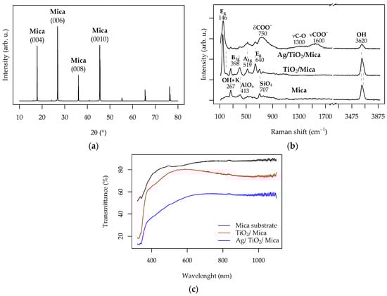 Characterization of the Ag/TiO2/mica substrates used for Cu-ELD: (a) A representative XRD pattern showing diffraction peaks from the mica substrate; (b) Raman spectra; and (c) UV/Vis transmittance spectra of the pristine, TiO2-functionalized, and Ag-activated substrates (photodeposition DUV of 2.5 J cm−2 in all cases).