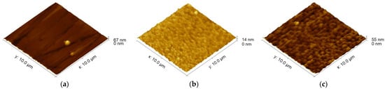 Surface morphology was investigated using AFM imaging, with representative images shown in Figure 5. The pristine mica surface (Figure 5a) had a smooth but slightly terraced morphology, possibly due to the imperfect cleavage of the technical-grade mica substrate. The root-mean-square (RMS) roughness (Rq) was found to be 3.87 nm. After TiO2 functionalization, the surface appeared smoother (Rq = 0.94 nm), and the polycrystalline anatase layer consisted of spherical grains with diameters under 100 nm (Figure 5b). After Ag photodeposition (Figure 5c), the surface coarsened, increasing the Rq to 5.12 nm.
