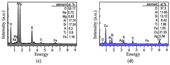 The composition results, obtained via EDX measurements, are displayed in Figure 6c,d, respectively. Initially, the pristine TiO2/Mica substrate exhibited a uniform, flat morphology, and the EDX analysis aligned well with the expected chemical composition of Muscovite 2M1 (KAl2(Si,Al)4O10(OH)2). However, trace amounts of Mg and Fe (≈1 at.%) were detected, which is not unexpected for naturally sourced, technical-grade mica []. The surface-deposited TiO2 was also detectable at 0.8 at.%, although the thinness of the layer and the high penetrability of the 20 kV electron beam likely contributed to this low value.