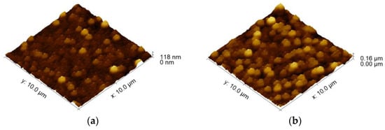 Additional AFM analysis was conducted to investigate the effects of the Cu-ELD duration on copper layer morphology. As shown in Figure 7a,b, which present AFM images of copper layers formed after 1 and 2 min of electroless deposition, there were no significant differences in morphology, with both layers exhibiting relatively flat copper domains of roughly spherical symmetry. However, increased coarseness was observed in the copper layer deposited for a longer time, corroborated by the root-mean-square (RMS) roughness measurements, where Rq increased from 13.64 nm to 23.23 nm.