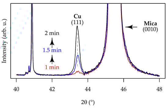 The phase composition of the Cu-ELD layer was further studied using XRD. Despite the dominance of mica reflection peaks in the Ag/TiO2/mica patterns (viz. Figure 4a), metallic copper was identifiable through the distinct Cu (111) reflection at 43.4° 2θ (PDF#03-065-9026). Figure 8 presents a close-up of this region in the XRD pattern for Cu-ELD layers formed on TiO2/Mica for 1, 1.5, and 2 min. The results clearly show that longer Cu-ELD durations led to an increase in the intensity of the Cu (111) peak, as the copper layer thickness increased. The mean crystallite sizes, determined from the FWHM of the Cu (111) peak using the Scherrer equation, were 38.3 nm, 39.1 nm, and 39.4 nm, respectively. This indicates that the layers are polycrystalline, with the domain-like features observed in SEM and AFM images consisting of multiple Cu grains, and that the plating duration had little effect on the crystallite size.