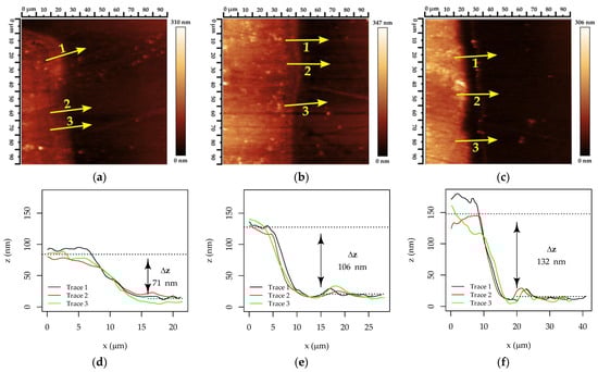 The substantial growth in Cu layer thickness during the 1–2 min of Cu-ELD was further confirmed by AFM microscopy, performed on the serpentine track topology (see Figure 2). Figure 9a–c shows AFM images at the interface between the Cu-ELD coated track and the uncoated TiO2/Mica substrate, with markers indicating the areas used to determine the height cross-section plots shown in Figure 9d–f.