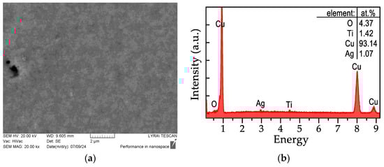 The Cu-ELD layer formed after 2 min of plating (Figure 6b) comprised flat, roughly spherical copper domains which were 50–100 nm in diameter. After Cu-ELD, copper became the dominant element in the EDX analysis (Figure 6d). The presence of both Ti and Ag from the Ag/TiO2/Mica underlayer also became more apparent due to the surface sensitivity of the measurement, enhanced by copper’s electron stopping power.