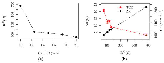 Summary of the effects of Cu-ELD plating time on the RTD functionality of Cu patterns: (a) initial resistance at 30 °C (R30) as a function of deposition time; (b) absolute change in resistance from 30 to 65 °C and TCR as a function of R30.