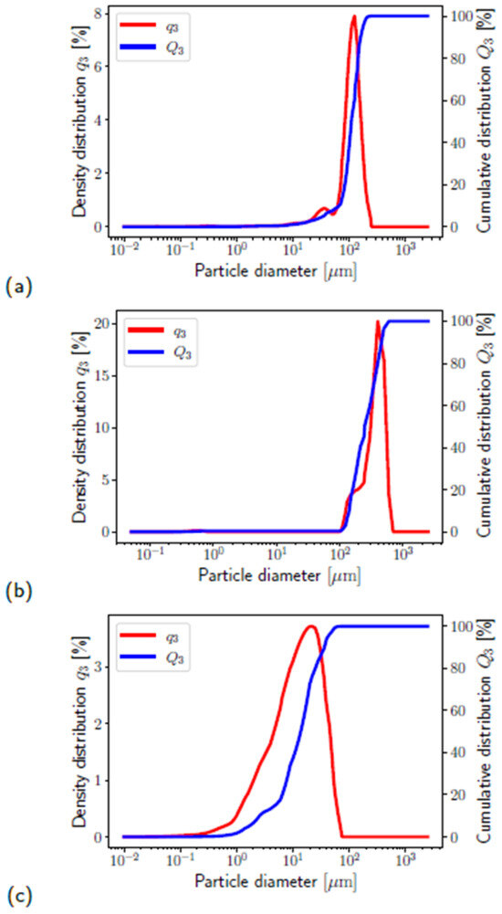 Particle size distribution of glass sphere (a), river sand (b), and fly ash (c).