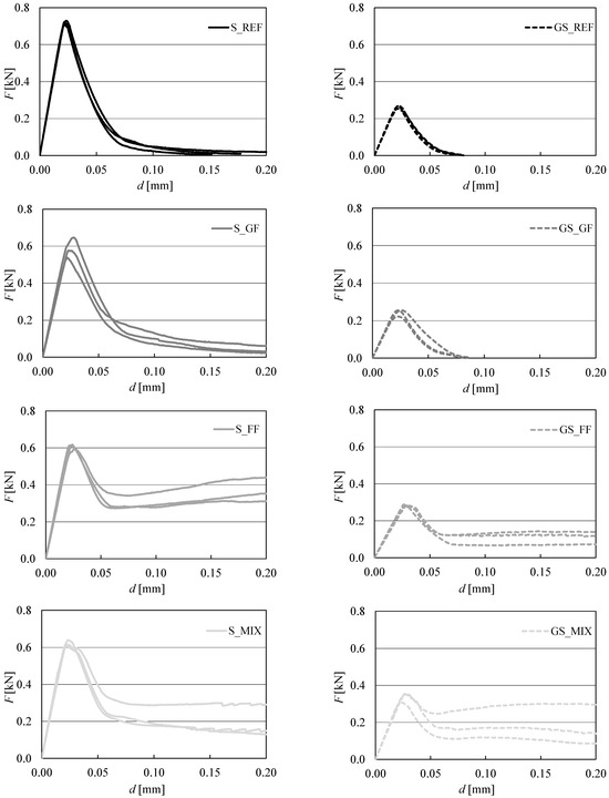 The last investigated parameter was specific fracture energy. At first, a part of the fracture energy Gf,1, considering the area under the F–d diagram up to the peak load Fmax, is discussed. In the case of S composites, the addition of fibers caused a decrease of about 10% in comparison with REF composites. It should be noted that the variability of results is quite high when the GF was used. On the contrary, a positive effect of the addition of the fibers was observed in the case of GS composites. The addition of fibers increased the value of fracture energy in the pre-peak part of the F–d diagram by more than 60%. Afterward, the area under the whole F–d diagram was considered for evaluation. As is evident from Figure 2, the addition of FF and the MIX of fibers had a positive effect on post-peak behavior for both types of composites. The fracture energy increased more than two times and three times in the case of S and GS composites, respectively, in comparison with the REF one. The addition of fibers led to a higher variability of the results, especially in the case of the MIX one, which could be connected with the non-uniform distribution of fibers.