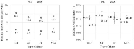 The results of the above-mentioned experiments are presented in the following figures. The mean values are represented by respective symbols according to the used aggregate (circle for river sand and square for glass spheres). The standard deviations are represented by error bars. In some cases, the coefficient of variation was low (under 5%); therefore, it is not possible to see error bars properly. Figure 3 shows the results of non-destructive measurements using the resonance method. The dynamic modulus of elasticity Edyn decreased with the addition of fibers in the case of the S composite. The highest decrease was about 18% for FF addition. A slight decrease was also observed for the GS composite containing only single-type fibers, while when the MIX of fibers was used, the value increased by about 10% in comparison with the REF composite. In general, it can be stated that the dynamic modulus of elasticity is significantly lower (less than half) for all GS composites compared to S composites. This relation is connected with a reduction in the density of the materials and the same mechanical properties. Based on the results and their variability, it can be stated that the addition of single-type fibers did not influence the value of the dynamic Poisson ratio νdyn in the case of S composites. The addition of MIX fibers led to a decrease of about 20%. On the other hand, the increase in the value of the dynamic Poisson ratio for all GS composites with fibers compared to REF was observed. The highest increase of almost 50% was observed for GS with the MIX of fibers.