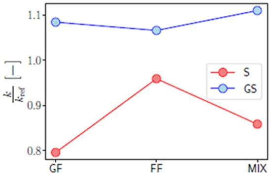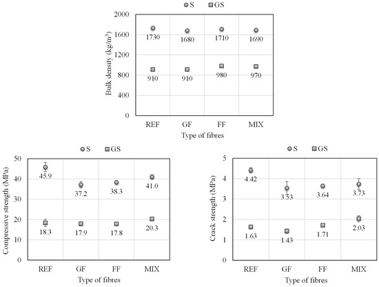 Figure 4 presents the results of basic physical and mechanical characteristics of investigated geopolymer composites with a standard deviation. In the case where the line of standard deviation is not visible, the values obtained from investigated specimens have very similar values, so the standard deviation was below 5%. The value of bulk density ρ is almost the same for all S composites, and the difference is less than 3%. In the case of the GS composite, the addition of GF did not affect bulk density; on the other hand, the addition of FF and the MIX of fibers increased the value by about 7%. The bulk density is about 45% lower in the case of GS composites in comparison with S composites.