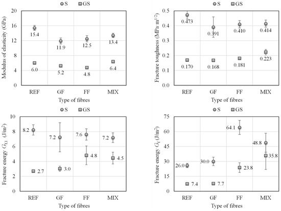 Figure 5 presents the results obtained from the evaluation of the F–d diagrams. The values of the modulus of elasticity show a similar trend as the values of the dynamic modulus of elasticity obtained from the resonance method for both composites. The absolute value of the static modulus of elasticity is about 15–25% higher in comparison with the dynamic one. The addition of fibers led to a decrease of about 15% in the effective fracture toughness in the case of the S composite. The addition of GF increased the variability of results in comparison with the REF composite and other types of fibers. On the other hand, in the case of the GS composite, the addition of fibers had a positive effect on the effective fracture toughness. The highest increase of about 30% was observed when the MIX of fibers was used.
