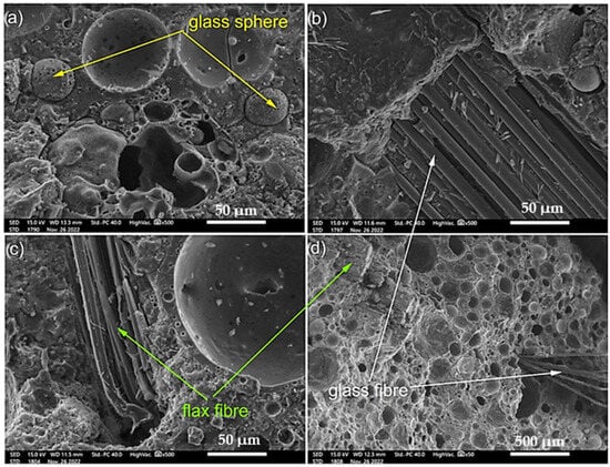 The microstructure of the composites in which the matrix consisted of fly ash and glass spheres (Figure 7a–d) demonstrated a different character. The deposition of glass and natural fibers and hybrid reinforcement is very similar; fiber agglomerates were visible, but the fibers were also well embedded in the geopolymer matrix. However, the matrix was characterized by significantly higher areas of undiluted fly ash particles and areas of glass bubbles.