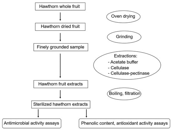 The production steps of the hawthorn extracts are summarized in Figure 2. Whole fruits were dried at 65 °C to constant weight (18–20 h). The dried material was ground to a fine powder and stored at room temperature until use. For enzyme-assisted extraction, the crude R. miehei cellulolytic enzyme extract, alone (designated as S1 sample) or in combination (designated as S2 sample) with A. niger pectinase (5 mg), was added to 5 g of fruit powder in 50 mL of acetate buffer (50 mmol/L, pH 5.0). The control sample was extracted with acetate buffer (50 mmol/L) alone without any enzyme (designated as C sample). Both enzyme-assisted and enzyme-free extractions of the hawthorn fruits were maintained for 5 h at 50 °C in an orbital shaker (KS 4000 ic control, IKA, Staufen, Germany) at 200 rpm. After that, the reaction was stopped by boiling the mixture for 3 min, and the mixtures were centrifuged (Sorvall RC 6 Plus, Thermo Fisher Scientific, Waltham, MA, USA) at 16,200× g for 10 min. The supernatant was then filtered through a 20 µm filter (Millex-GN, nylon, Merck Millipore Ltd., Carrigtwohill, Ireland) and sterilized using a 0.45 µm filter (Millex-HV, PVDF, Merck Millipore Ltd., Carrigtwohill, Ireland). The sterilized extract was stored at −20 °C until use. Extract concentrations were 120.25, 176.25, and 155.75 mg/mL for the C, S1, and S2 samples, respectively, determined by lyophilizing (Christ Alpha 1–4 freeze dryer, Martin Christ GmbH, Osterode am Harz, Germany) a 1 mL extract sample until completely dry and then measuring the weight of the remaining dry material. For antimicrobial investigations, stock solutions with concentrations of 240.5, 352.5, and 311.5 mg/mL were prepared from C, S1, and S2 samples, respectively, in 10% (v/v) ethanol.