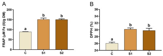 FRAP activity (A) and DPPH radical scavenging capacity (B) of hawthorn fruit extracts prepared by acetate buffer (C), cellulase (S1), and cellulase–pectinase (S2) extractions. The values shown are averages of the data obtained from three measurements; error bars represent the standard deviation. The different letters above the columns indicate significant differences according to one-way ANOVA followed by Tukey’s multiple comparison test (p < 0.05).