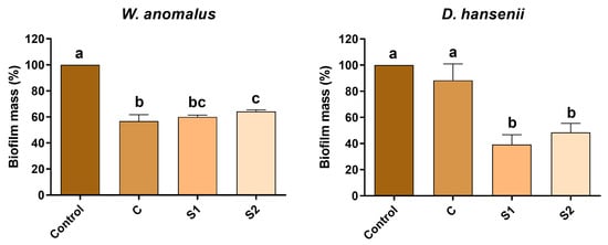 Inhibitory capacity of hawthorn fruit extracts prepared by acetate buffer or via enzyme-assisted extraction against W. anomalus and D. hansenii yeast biofilms. C–acetate buffer extraction, S1–extraction with R. miehei cellulase cocktail, S2–extraction with pectinase supplemented R. miehei cellulase cocktail. Extracts with concentrations of 120.25 (C), 176.25 (S1) and 155.75 (S2) mg/mL were used in the tests. The control (Control) represents the biofilm formation in the absence of hawthorn residue extract. The values shown are averages of the data obtained from three measurements; error bars represent the standard deviation. The different letters above the columns indicate significant differences according to one-way ANOVA followed by Tukey’s multiple comparison test (p < 0.05).