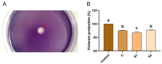 Inhibition of violacein production in C. violaceum 85WT quorum-sensing biosensor bacterium by hawthorn extracts. (A) Reduced pigment synthesis around the disk impregnated with acetate buffer extracted hawthorn sample (1.2 mg/disk). The red arrow indicates the non-purple ring around the disk. (B) Percent violacein production in liquid culture assay in the presence of hawthorn extracts prepared by acetate buffer (C, 1.2 mg/mL reaction mixture), R. miehei cellulase (S1, 1.7 mg/mL reaction mixture) and R. miehei cellulase–A. niger pectinase (S2, 1.5 mg/mL reaction mixture) extractions. Violacein production measured in the absence of the given extract was taken as 100% (Control). The values shown are averages of the data obtained from three measurements; error bars represent the standard deviation. The different letters above the columns indicate significant differences according to one-way ANOVA followed by Tukey’s multiple comparison test (p < 0.05).