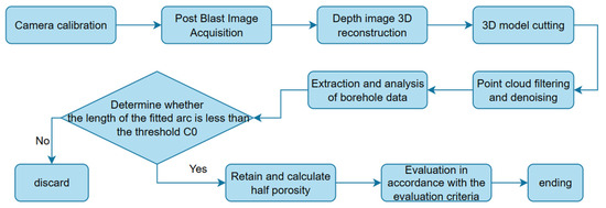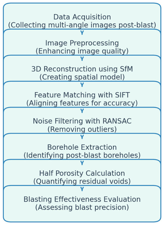 To provide a clear overview of this process, Figure 1 presents a flowchart that outlines each stage of the 3D reconstruction and evaluation workflow, from data acquisition to the final calculation of half porosity and assessment of blasting effectiveness. This chart visually represents the full workflow, highlighting the synergy of the individual algorithms—Structure-from-Motion (SfM), Scale-Invariant Feature Transform (SIFT), and Random Sample Consensus (RANSAC)—within the context of tunnel blasting evaluation.