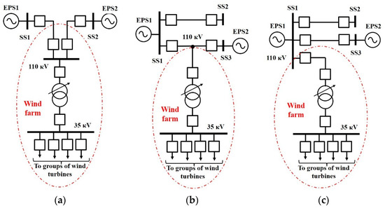 Simplified single-line schemes of wind farm connection to the distribution network: (a) “input–output”; (b) “a branch from power transmission line” with “line-transformer” block; and (c) “line-transformer” block with connection to the substation busbars.