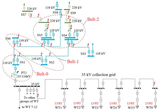 An analysis of the causes of wind turbine shutdowns suggests that they occur in case of short circuits (SCs) in the distribution network, which are cleared by the action of backup protections with time delays of 1–2 s and are accompanied by voltage dips. This decreases the power generated by wind farms to “zero”, increases the load of the generating units of conventional power plants, power transmission lines (TLs), and power transformers, and causes the disconnection of electricity to consumers [11,12,13].
