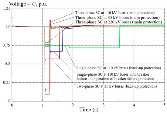 The calculations factored in the total short-circuit clearance time, including the opening time of the high-voltage circuit breakers, and the operating time of the relay protection devices (main protection; second and third stages of backup protection) and automatic controls (automatic reclosing and breaker failure protection) [49,50].